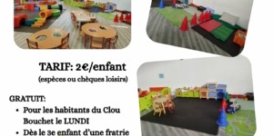 Espace ludique couvert pour les enfants de 0 à 7 ans accompagnés d’un adulte. Horaires : 9h30 – 12h00 et de 14h30 – 17h00 2€/enfant Gratuit : Dès le 3ème …