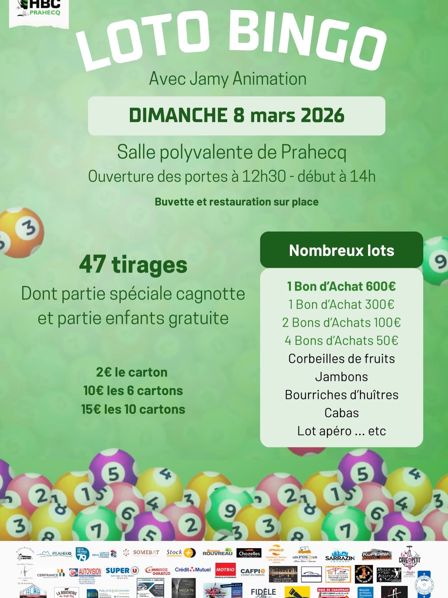 Loto Bingo avec Jamy Animation dimanche 8 mars 2026 à 14h00 (ouverture des portes à 12h30) salle polyvalente de Prahecq près de Niort.