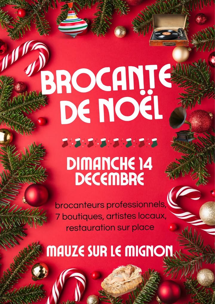 Brocante de Noël dimanche 14  décembre 2025 à Mauzé sur le Mignon près de Niort avec brocanteurs professionnel, et artistes qui déballent dans la grand Rue.