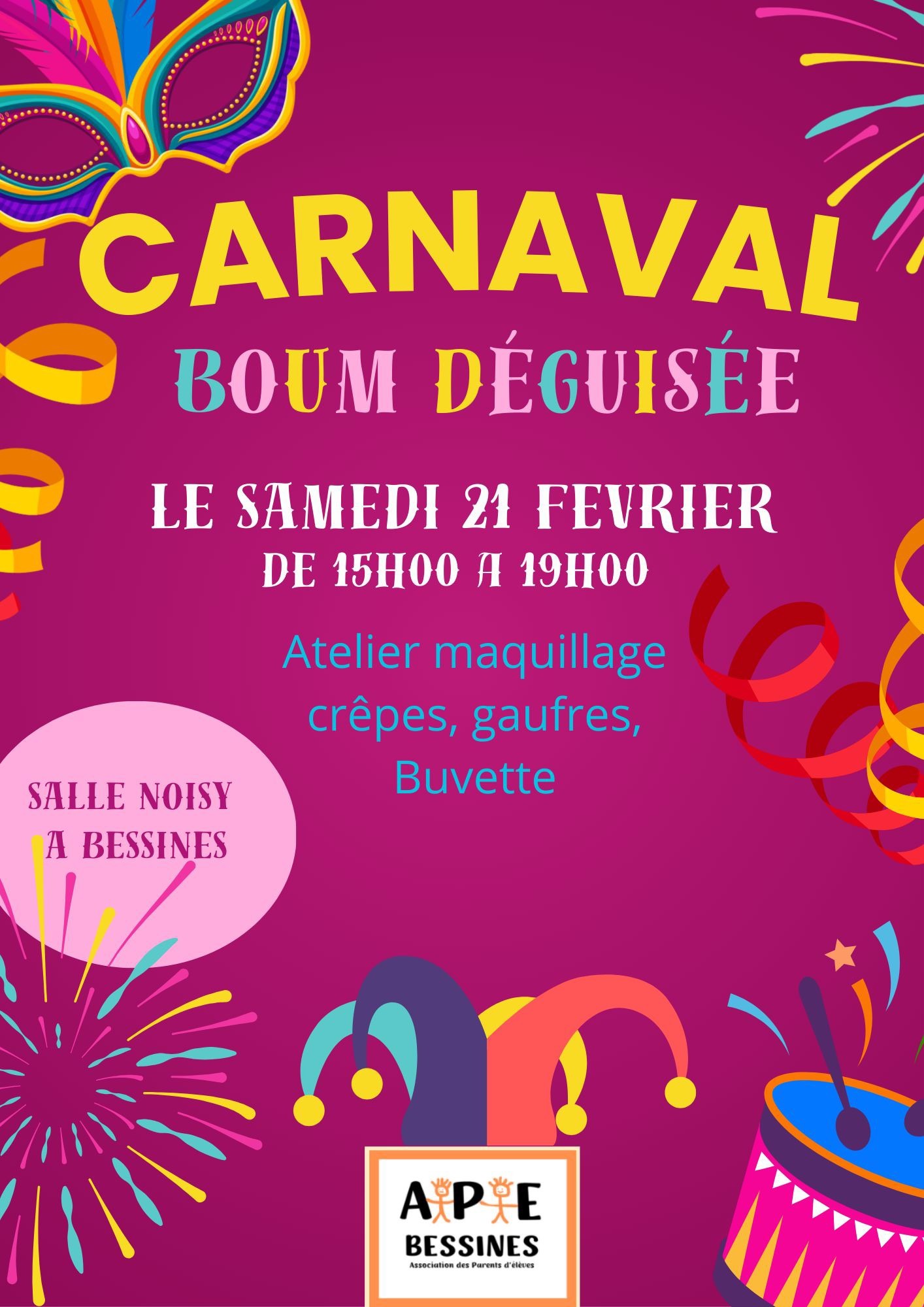 Réservez votre samedi 21 février, pour la boum déguisée du Carnaval de l’APE de Bessines, à la salle de Noisy.