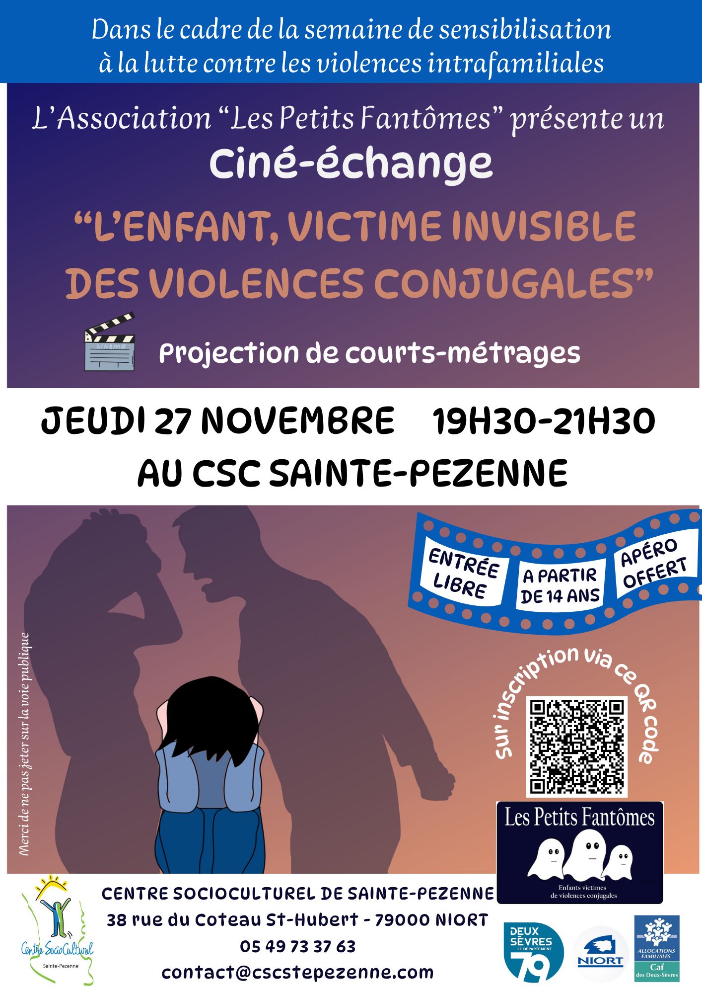 Dans le cadre de la semaine de sensibilisation aux violences conjugales, Les Petits Fantômes et le Centre Socioculturel de Sainte-Pezenne vous invitent à une soirée ciné-échange autour d’un sujet trop souvent ignoré : l’impact des violences conjugales sur les enfants.