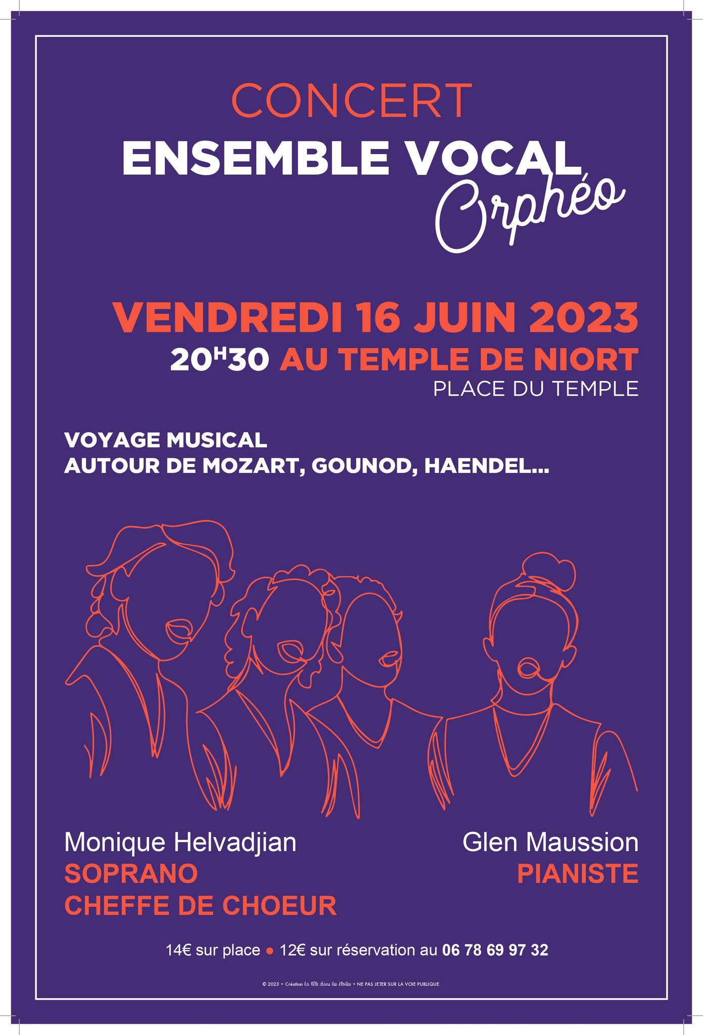 Concert de l’Ensemble Vocal Orphéo pour un voyage musical autour de Mozart, Gounod, Haendel… vendredi 16 juin 2023 à 20h30 au Temple de Niort.