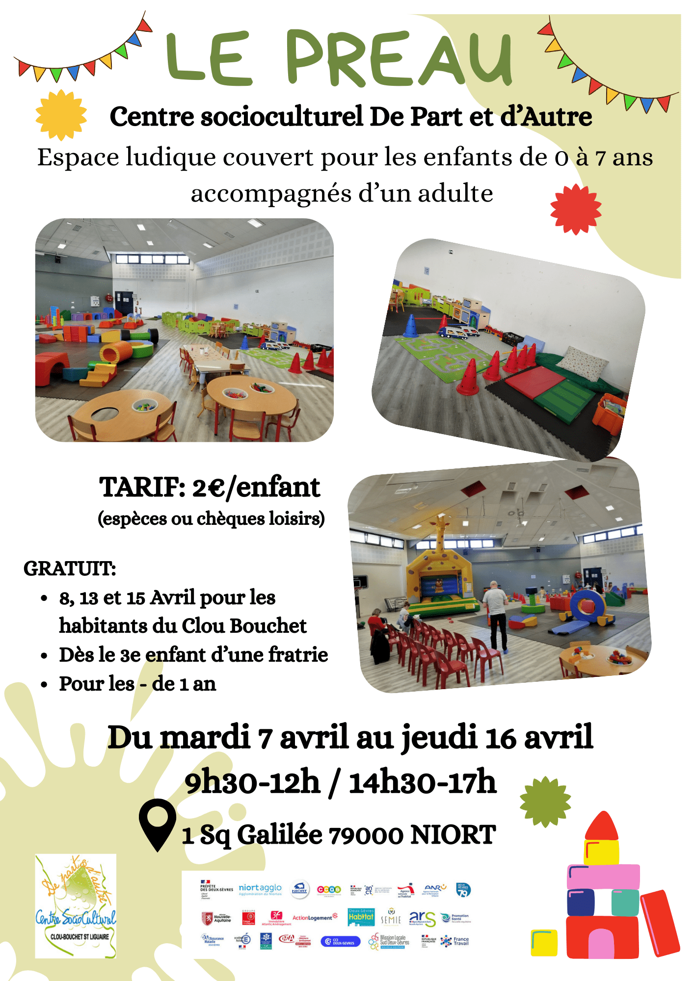 Espace ludique couvert pour les enfants de 0 à 7 ans accompagnés d’un adulte.