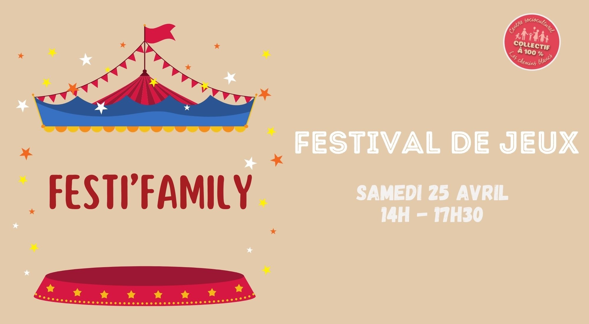Dans le cadre des 20 ans du CSC, nous vous invitons le samedi 25 avril , de 14h à 17h30 au Festi’Family, un mini festival de jeux à partager ensemble, sous le chapiteau