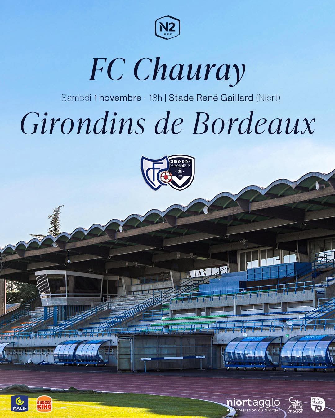 Le samedi 1er novembre, le FC Chauray recevra les Girondins de Bordeaux au stade René Gaillard à Niort, pour la 9e journée de championnat !