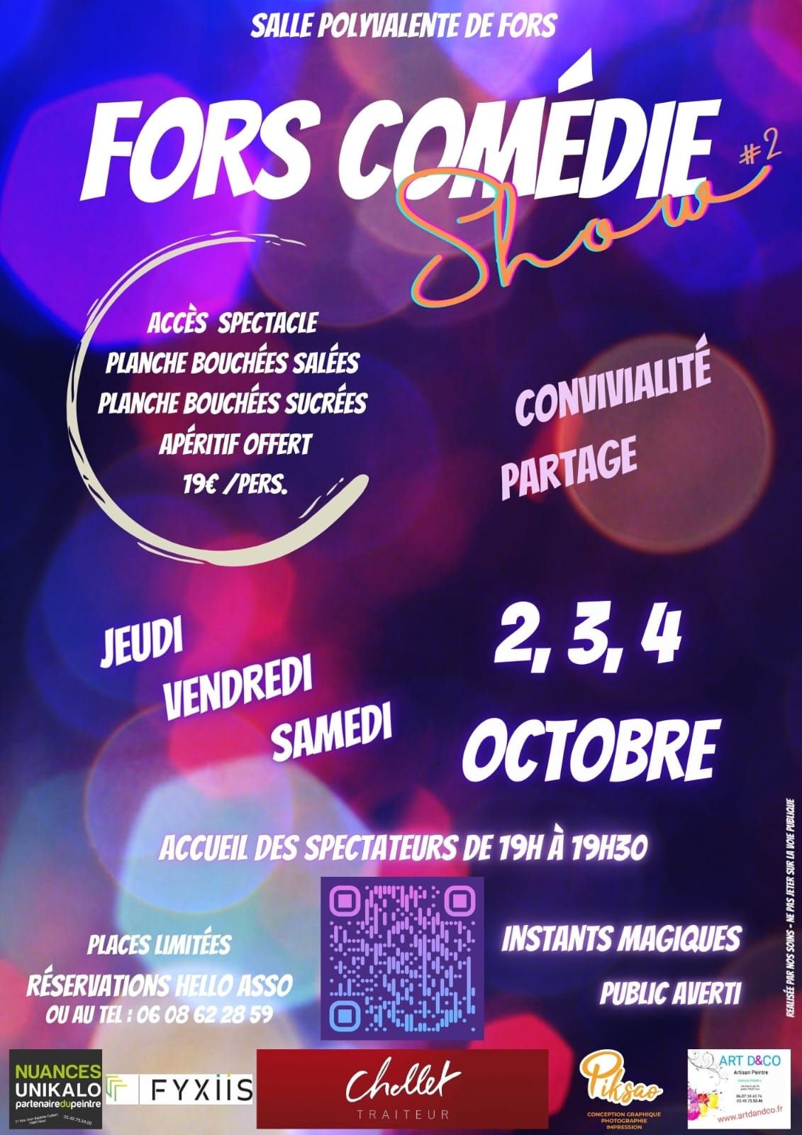 Spectacle Vivant / Humour / Partage / Convivialité sont au programme du Fors Comédie Show du jeudi 2 au samedi 4 octobre 2025 à la salle polyvalente de Fors près de Niort.