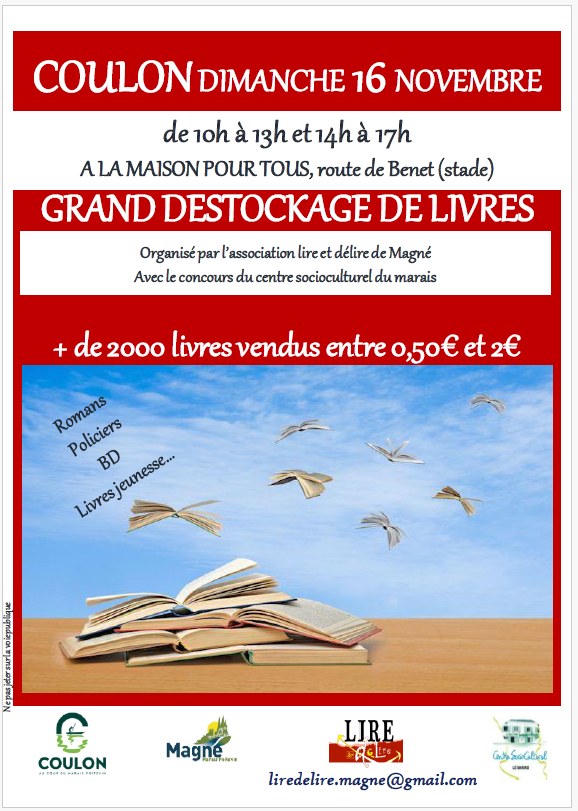 L’association Lire&Délire vous propose son grand déstockage de livres le dimanche 16 novembre à la « Maison Pour Tous » à Coulon.