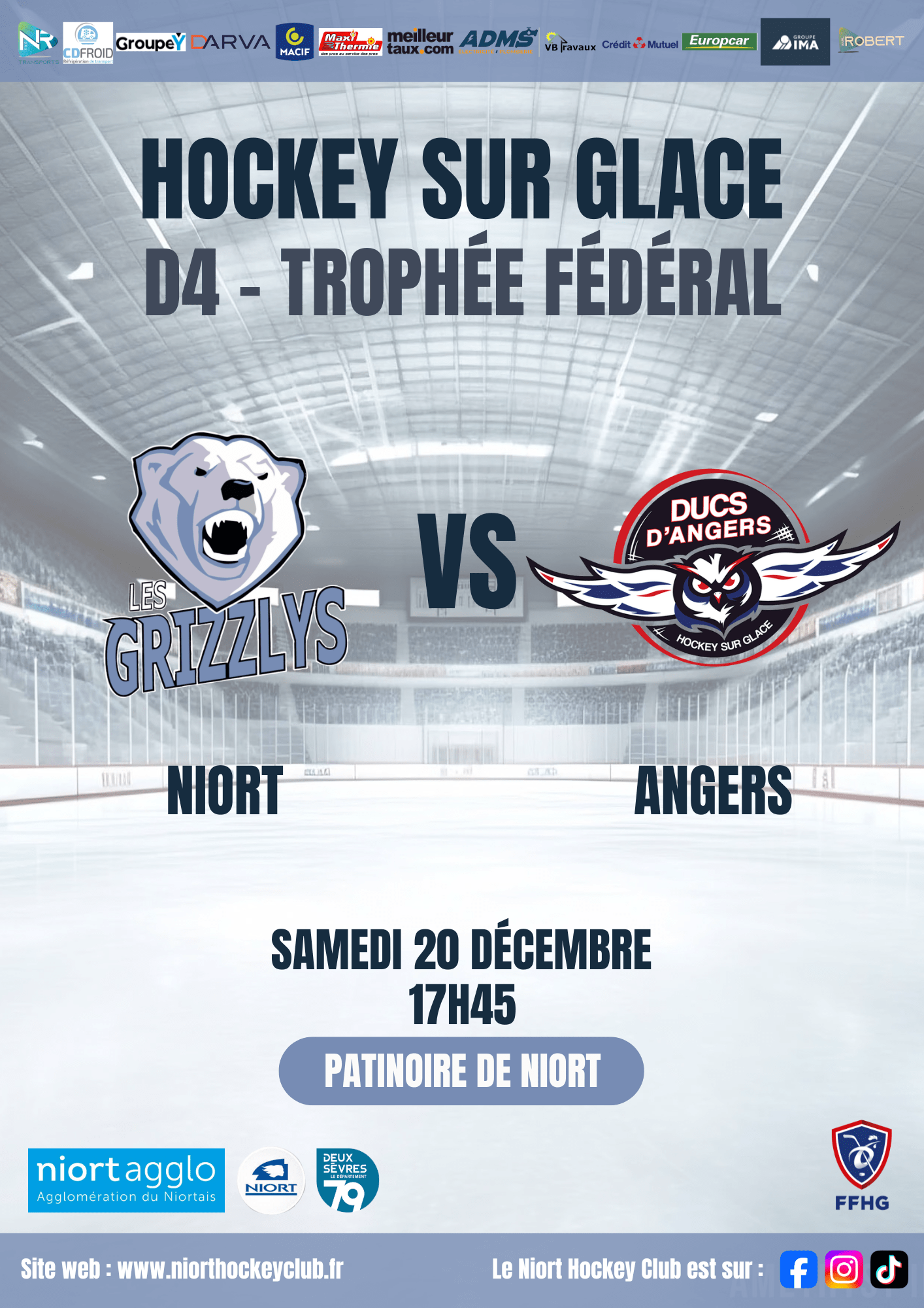 Notre belle patinoire accueille le samedi 20 décembre son second match de trophée fédéral des Grizzlys – Niort Hockey club contre les Ducs d’Angers en hockey sur glace.