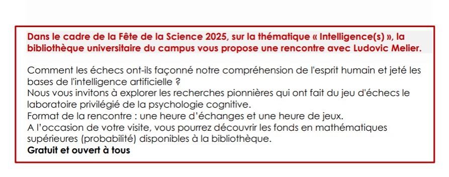 La rencontre avec Ludovic Melier de l’association Ludochess intitulée : L’histoire de la psychologie du jeu d’échecs qui se tiendra le jeudi 9 octobre de 13h30 à 15h30 à la bibliothèque universitaire du campus de Niort – Université de Poitiers.