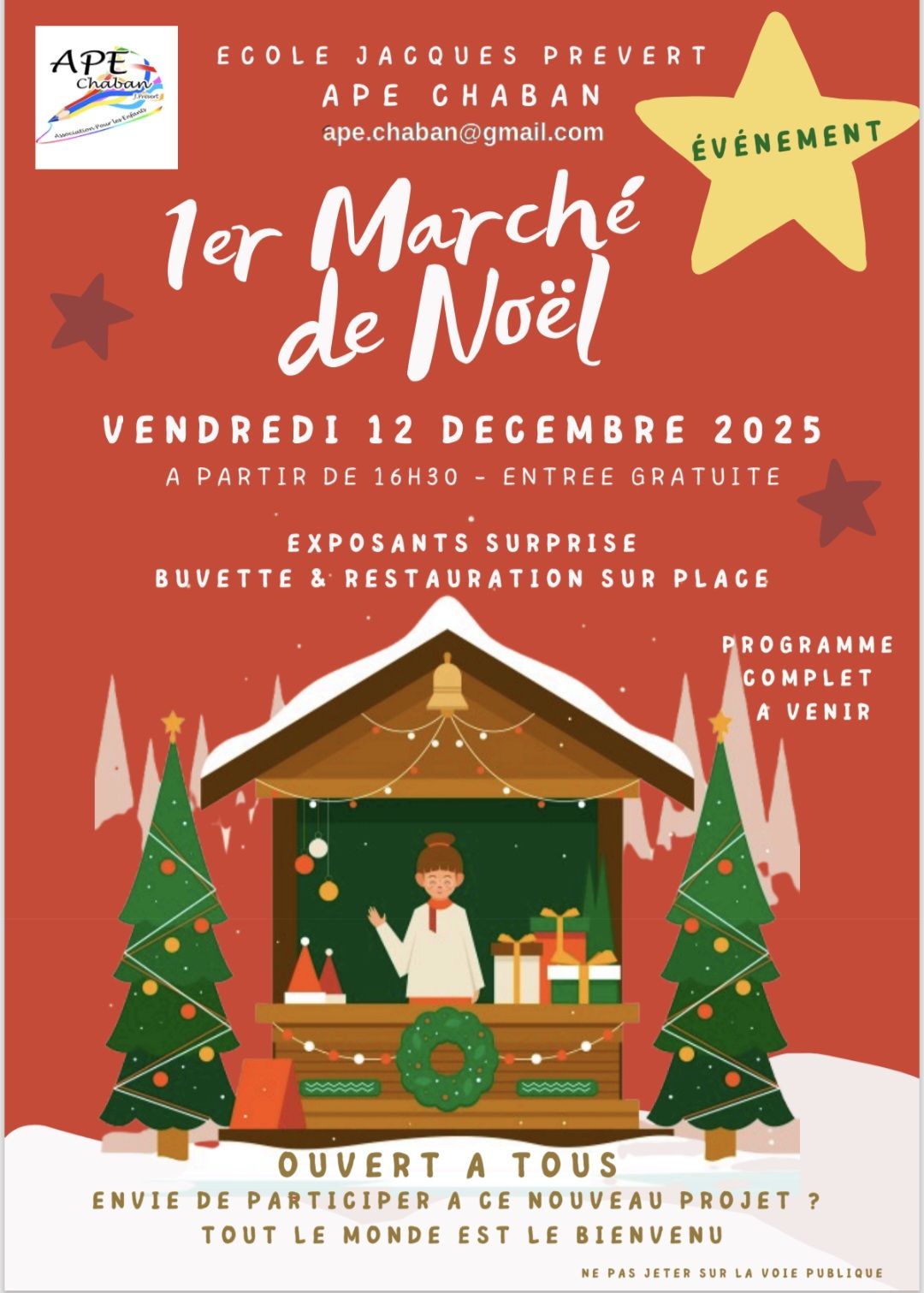 L’APE Chaban organise un marché de Noël le vendredi 12 décembre 2025 à partir de 16h30 à l’école.