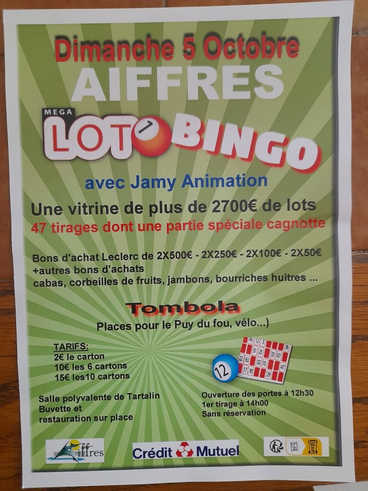 Méga Loto/Bingo avec Jamy Animation dimanche 5 octobre 2025 à 14h00 (ouverture des portes à 12h30) à l’Espace Tartalin à Aiffres.