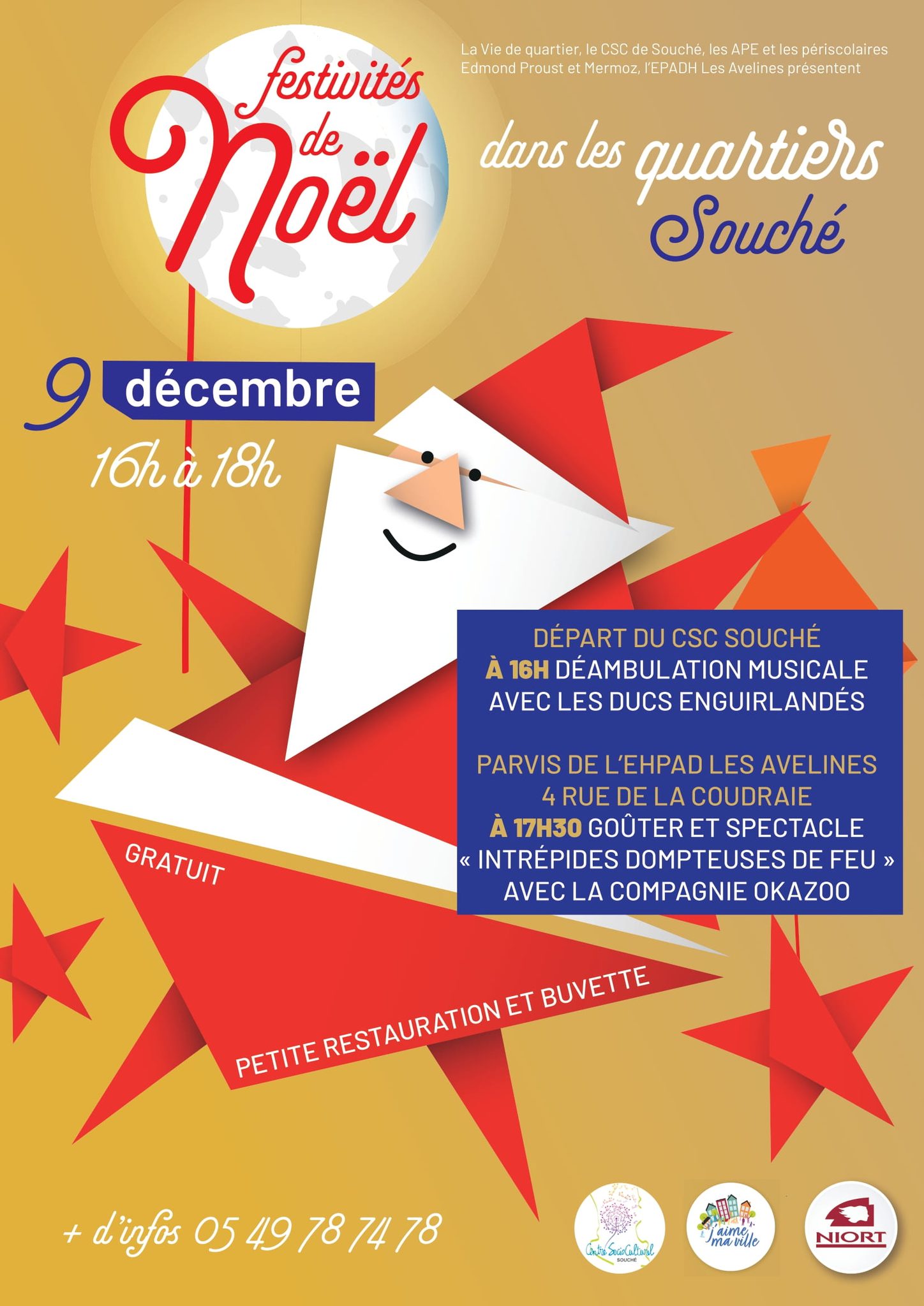 • 16h00 :Déambulation musicale avec Les Ducs Enguirlandés pour Noël en quartet au départ du CSC Souché (avec goûter)