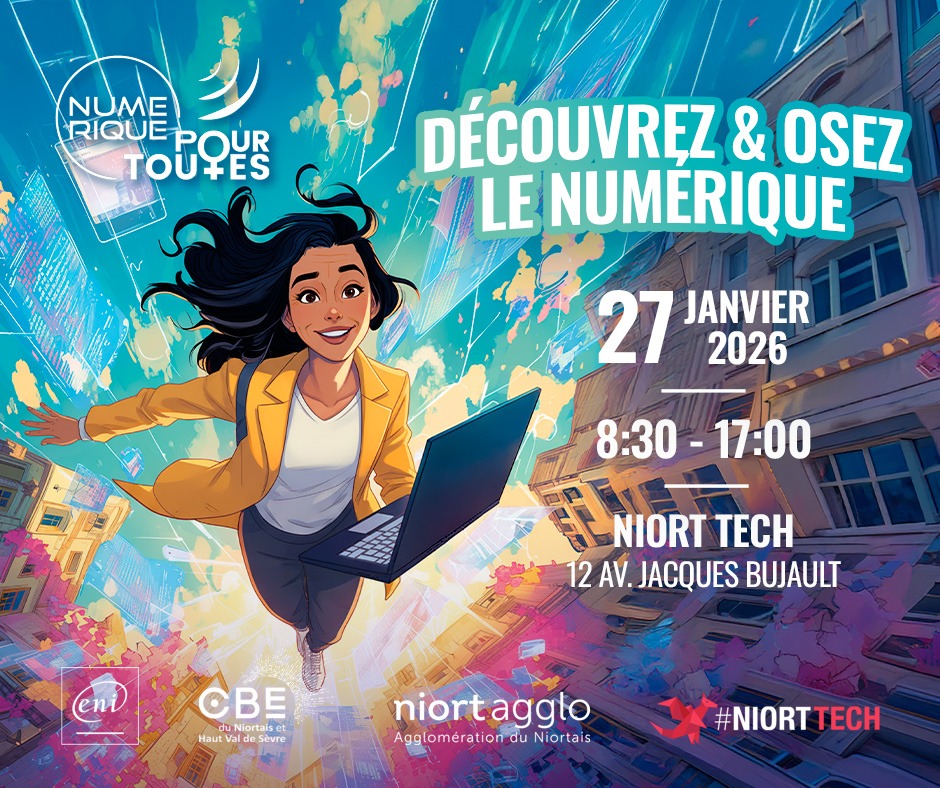 Numérique pour Toutes, c’est une journée unique, organisée par Niort Agglo, Niort TECH, l’ENI et le CBE, le 27 janvier 2026 à Niort TECH, pour :