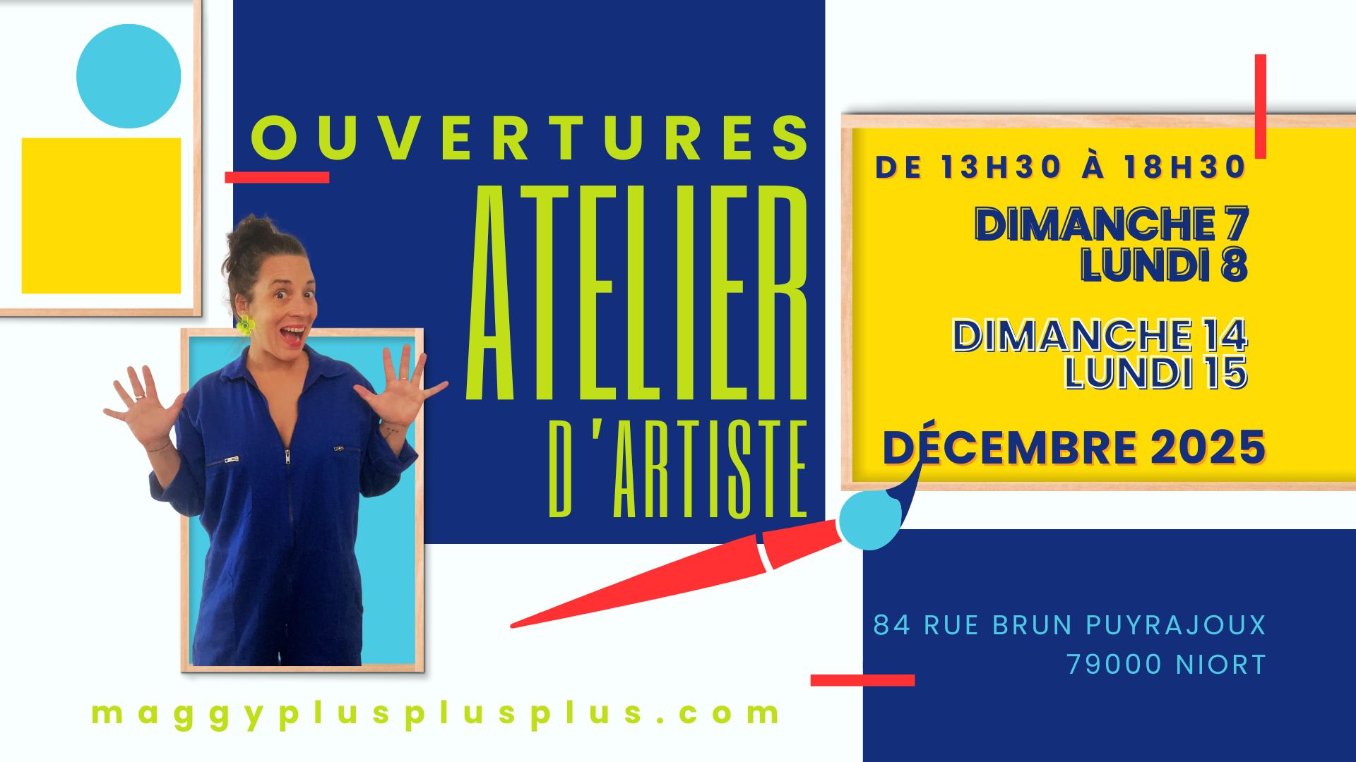 Maggyplusplusplus est heureuse d’ouvrir les portes de son atelier les dimanche 7, lundi 8, dimanche 14 et lundi 15 décembre, de 13h30 à 18h30, à Niort.