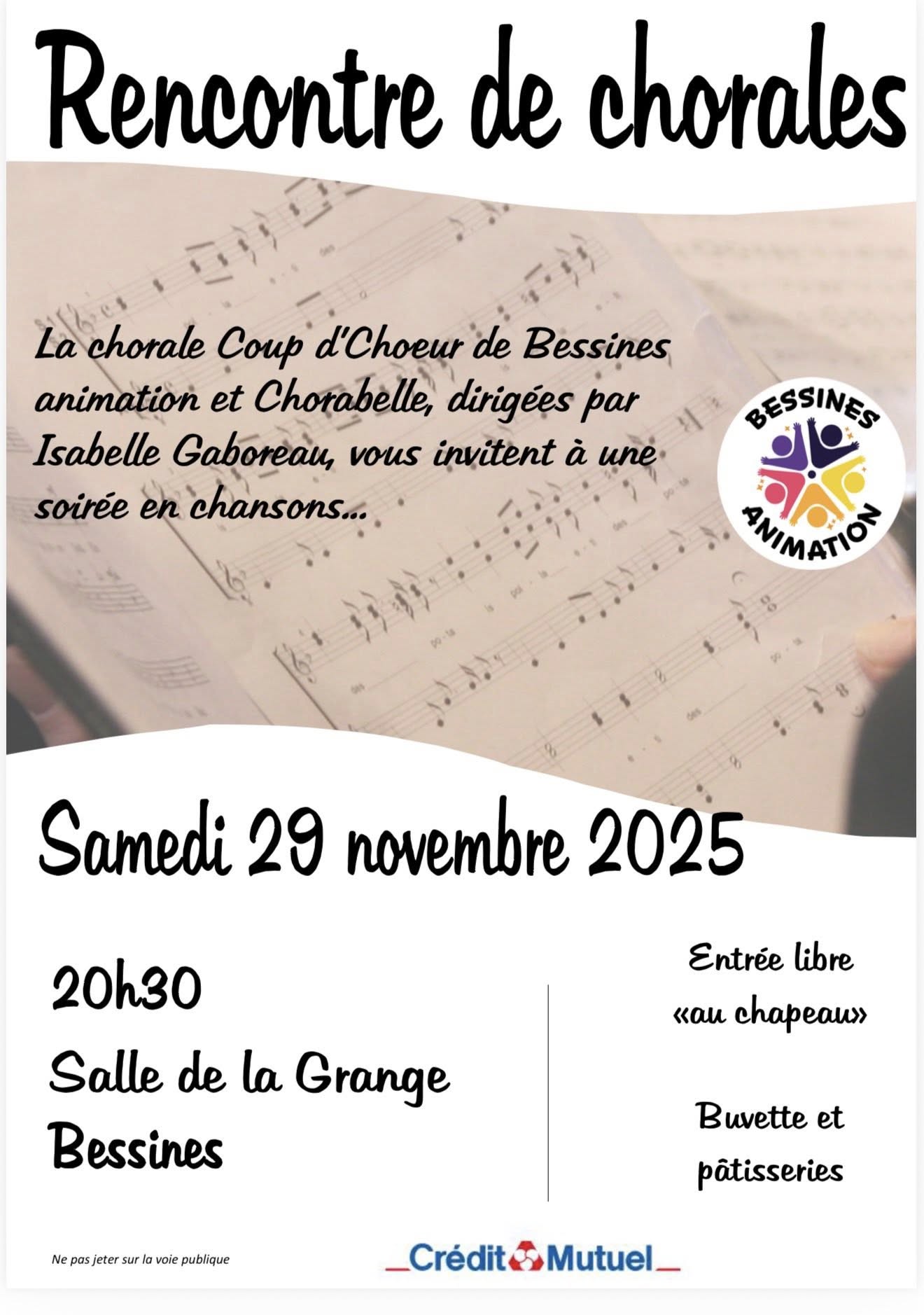 Rassemblement de chorales avec La chorale « Coup d’Choeur de Bessines » de Bessines Animation et Chorabelle, dirigées par Isabelle Gaboreau, le samedi 29 novembre 2025 à 20h30 à la salle de la Grange à Bessines près de Niort.