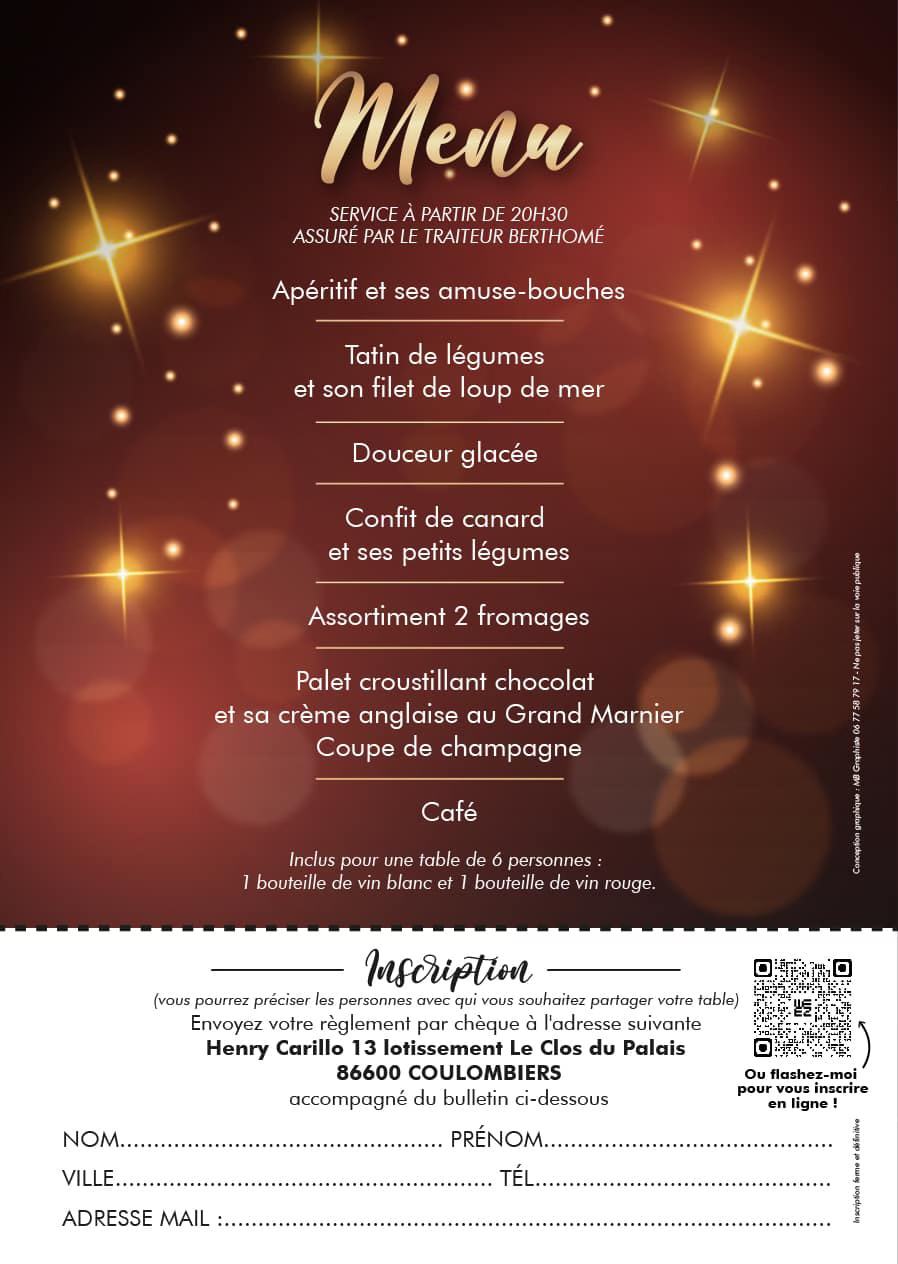 Réveillon du Nouvel An mardi 31 décembre 2024 à partir de 19h30 à la salle des fêtes d’Épannes près de Niort.
