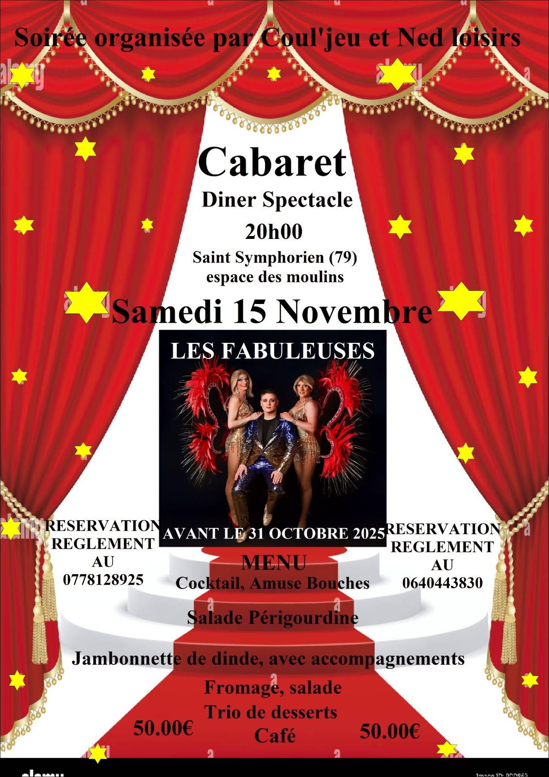 Soirée Cabaret (dîner-spectacle) samedi 15 novembre 2025 à 20h00 à l’Espace des Moulins à Saint-Symphorien près de Niort.