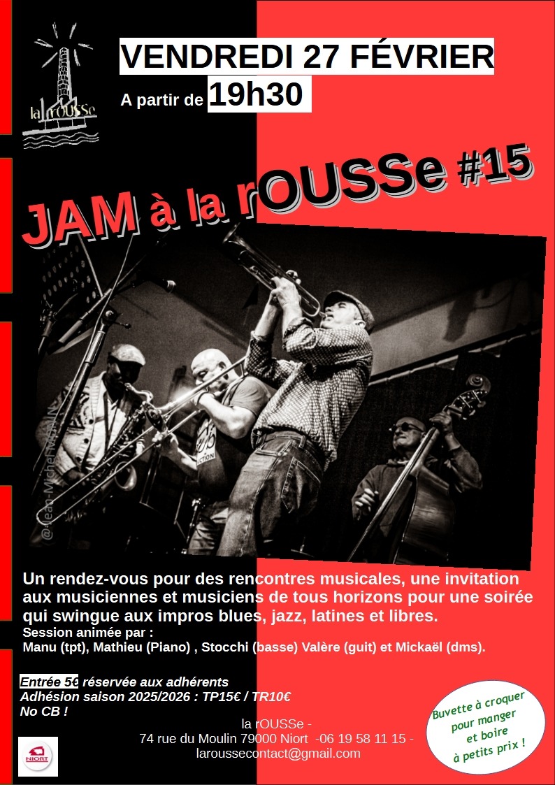 Second Jam de la saison, « the jam à la rOUSSe » pour une soirée qui swing vendredi 27 février 2026 à partir de 19h30 à La rOUSSe à Niort.