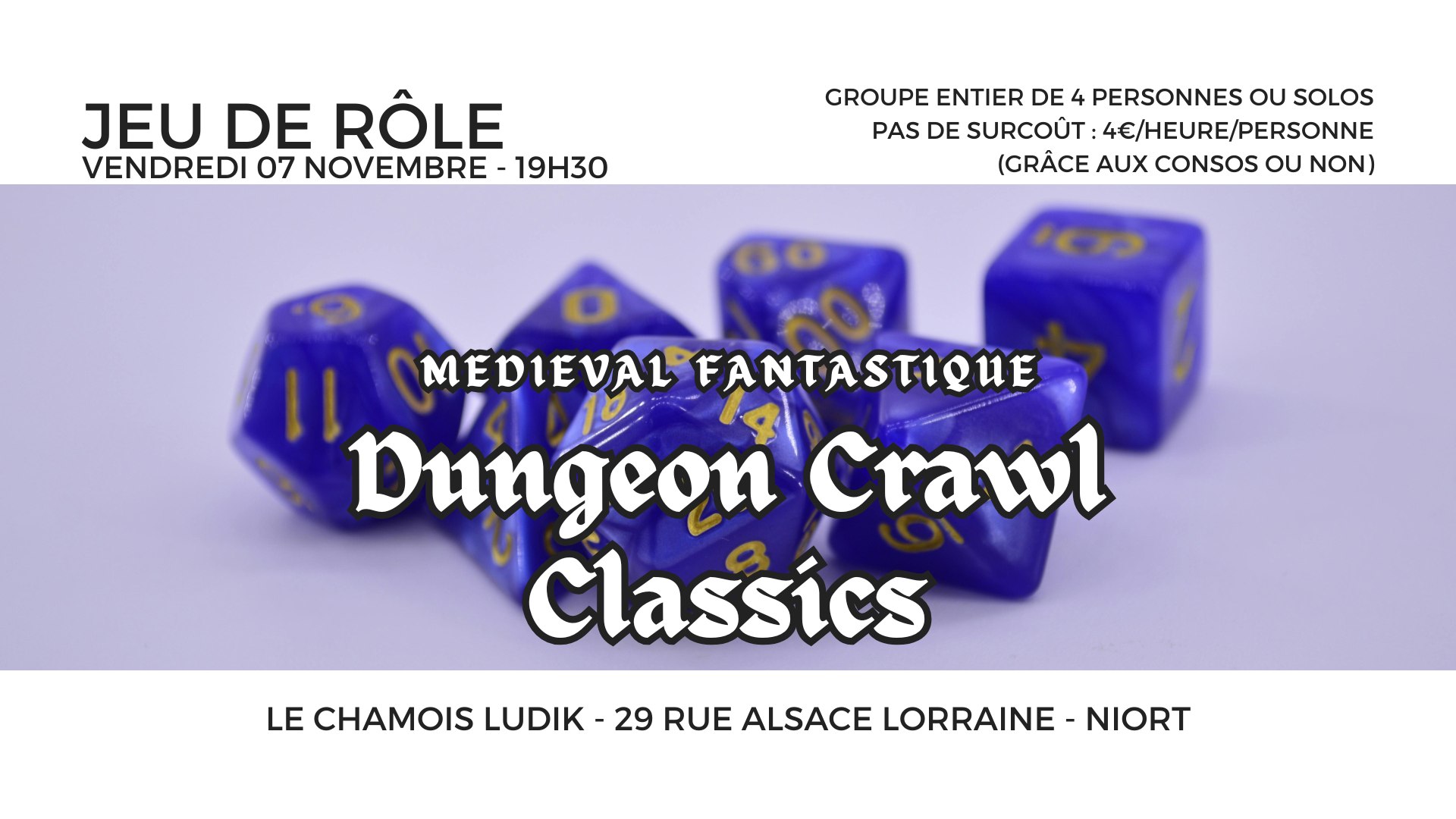 Ce vendredi 7 novembre à 19h30, rejoignez une session one shot de Dungeon Crawl Classics, un jeu de rôle old-school où la chance, la folie et la mort se côtoient à chaque lancer de dé.