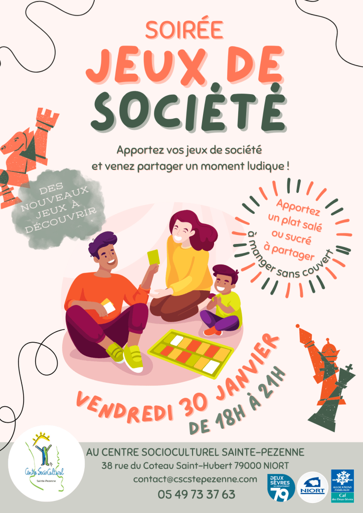 Soirée Jeux de société vendredi 30 janvier 2026 de 18h à 21h au CSC Sainte-Pezenne à Niort.