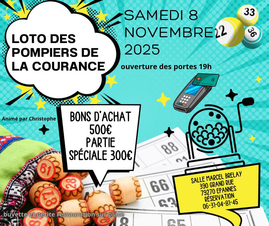 Loto des Pompiers de la Courance samedi 8 novembre 2025 (ouverture des portes à 19h00) salle Marcel Brelay à Epannes près de Niort.