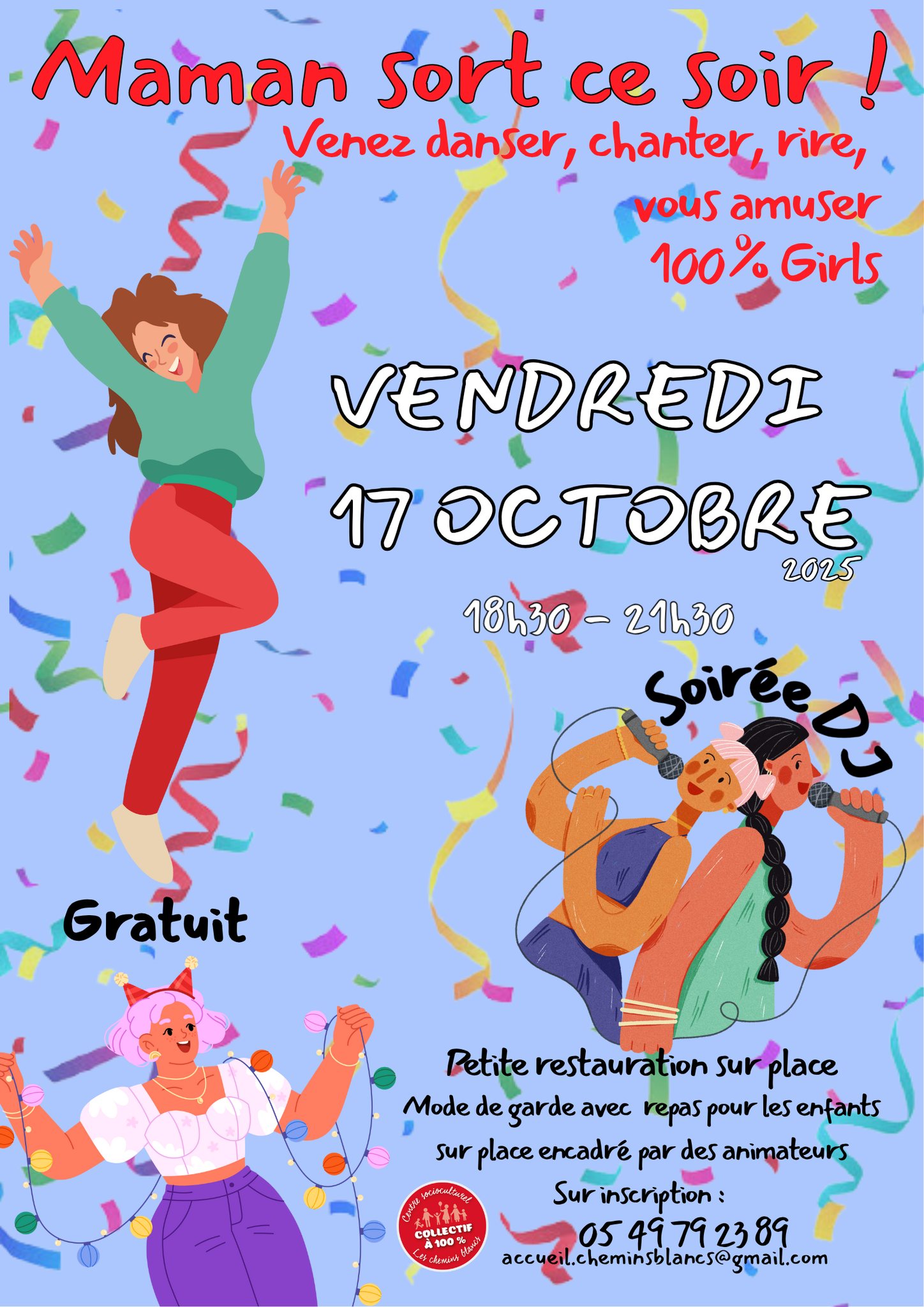 Soirée « Maman sort ce soir ! » vendredi 17 octobre 2025 de 18h30 à 21h30 au CSC Les Chemins Blancs à Niort.