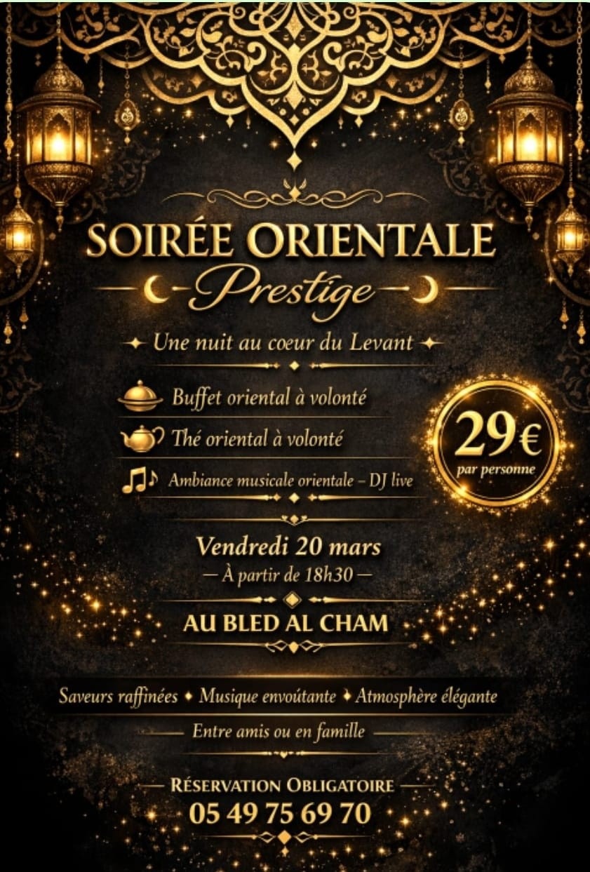 Soirée orientale vendredi 20 mars 2026 à partir de 18h30 au restaurant Au Bled Al Cham à Niort.