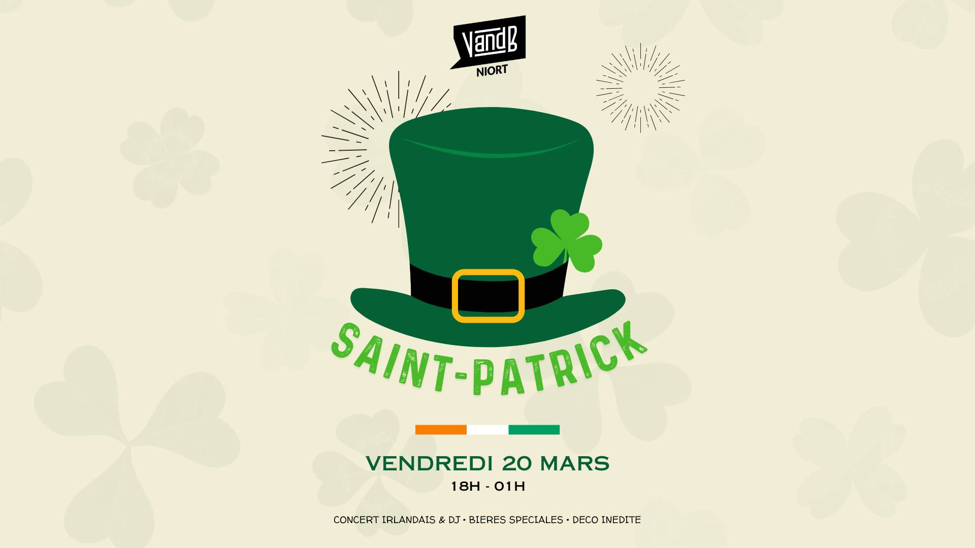 Ton V and B Niort se transforme le vendredi 20 mars 2026 pour une soirée Saint Patrick exceptionnelle :