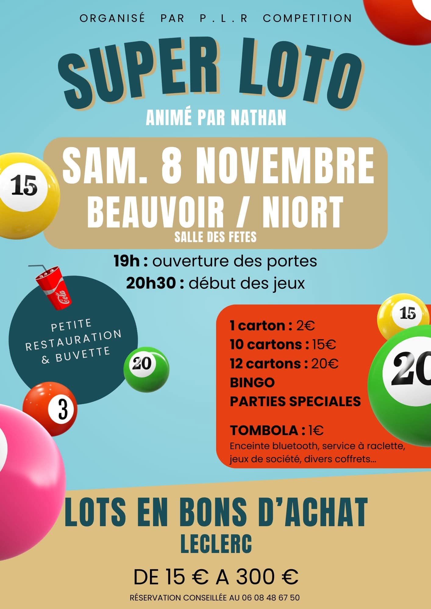 Soirée Super Loto samedi 8 novembre 2025 à 20h30 (ouverture des portes à 19h00) à la salle des fêtes de Beauvoir-sur-Niort près de Niort.