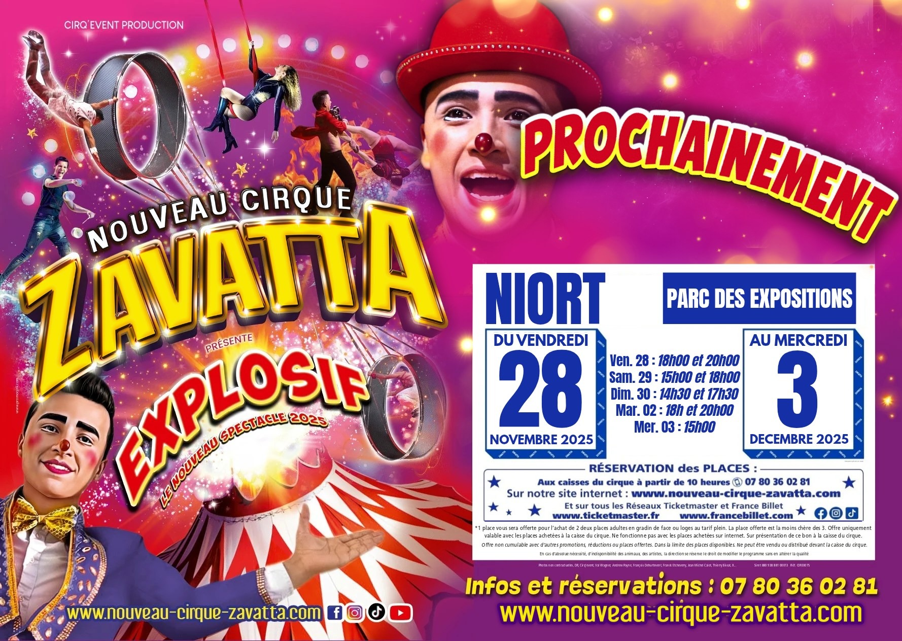 Le Nouveau Cirque Zavatta vous invite à venir découvrir son tout nouveau spectacle 2025 « EXPLOSIF » du 28 novembre au 3 décembre 2025 au Parc des Expositions de Niort.