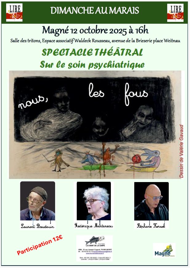 Dans le cadre du « Dimanche au marais » de Lire & Délire, découvrez le spectacle théâtral sur le soin psychiatrique intitulé « Nous les fous » qui se déroulera à Magné, salle des tritons Espace associatif Waldeck Rousseau le 12 octobre à 16h.