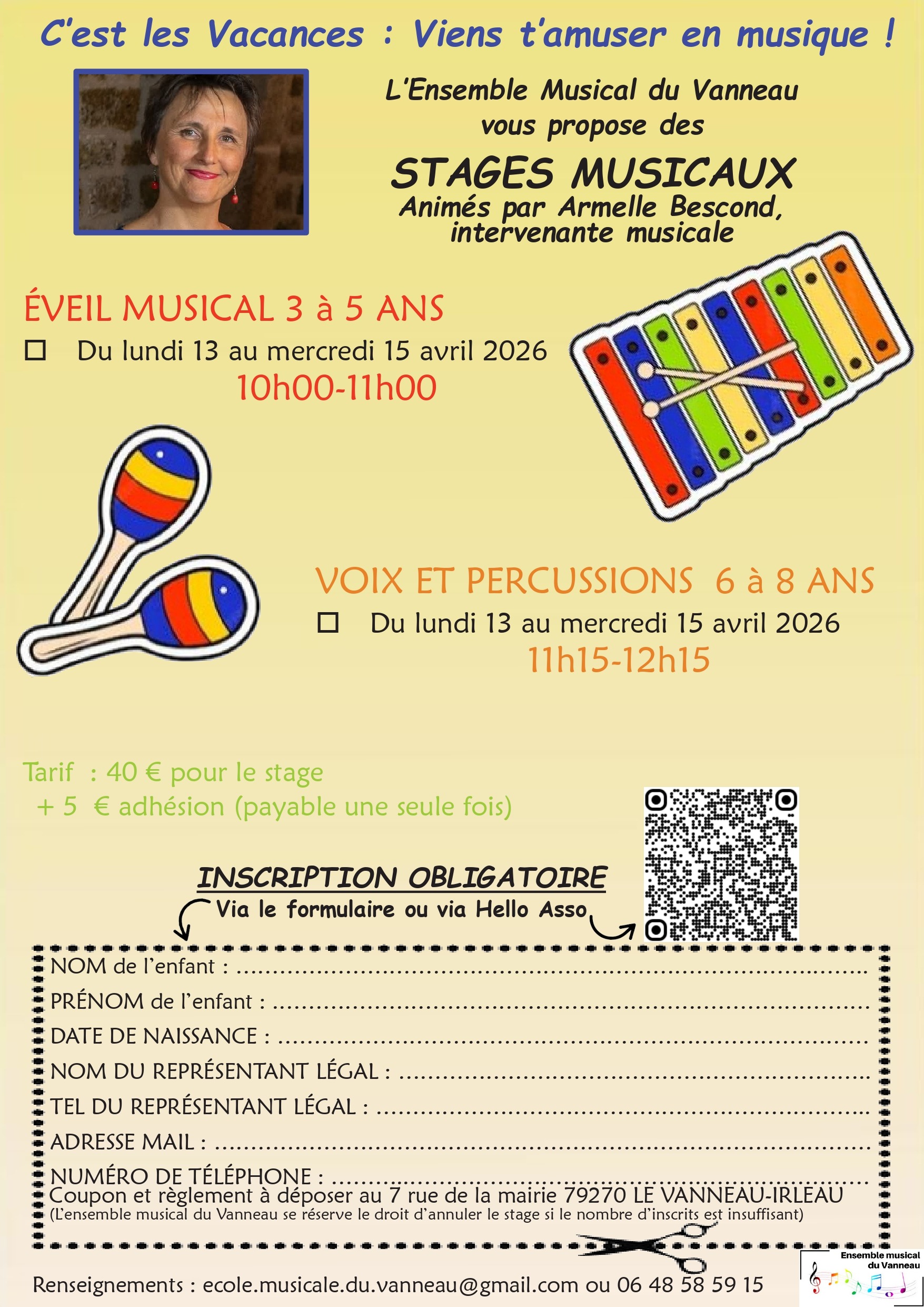 L’Ensemble Musical du Vanneau organise, pendant les vacances scolaires, plusieurs stages musicaux destinés aux jeunes enfants. Ces ateliers sont animés par Armelle Bescond, intervenante musicale, et se déroulent au Vanneau (79270) sur 3 jours :