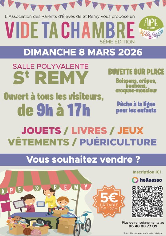 L’APE de St Rémy (Ecole Maison de la Plaine) vous propose une 5ème édition de son “Vide ta Chambre” le dimanche 8 mars de 9h à 17h à la salle polyvalente de St Rémy pour aider au financement des projets éducatifs de l’école.