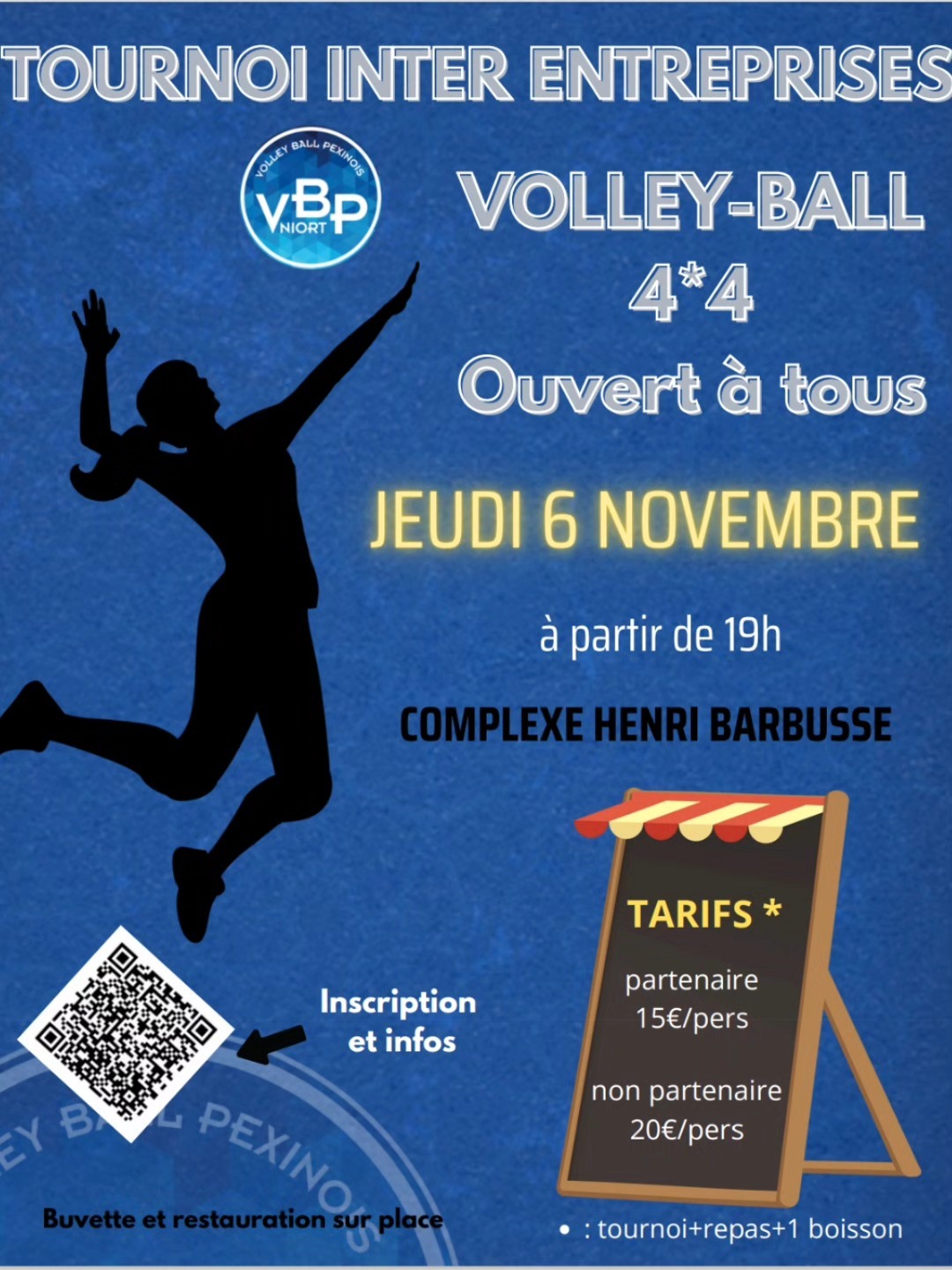 Inscriptions et infos via le QR code sur l’affiche ou avec le lien ici : https://www.helloasso.com/associations/vbpniort/evenements/tournoi-inter-enteprises-edition-9