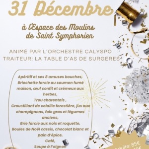 Réveillon de la Saint-Sylvestre à l’Espace des Moulins à Saint-Symphorien près de Niort mercredi 31 décembre 2025. Repas par le maitre restaurateur La Table d’A.S de Surgères Animation par l’orchestre ...