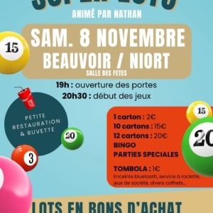 Super Loto animé par Nathan samedi 8 novembre 2025 à 20h30 (ouverture des portes à 19h00) à la salle des fêtes de Beauvoir-sur-Niort près de Niort. Petite restauration et buvette ...
